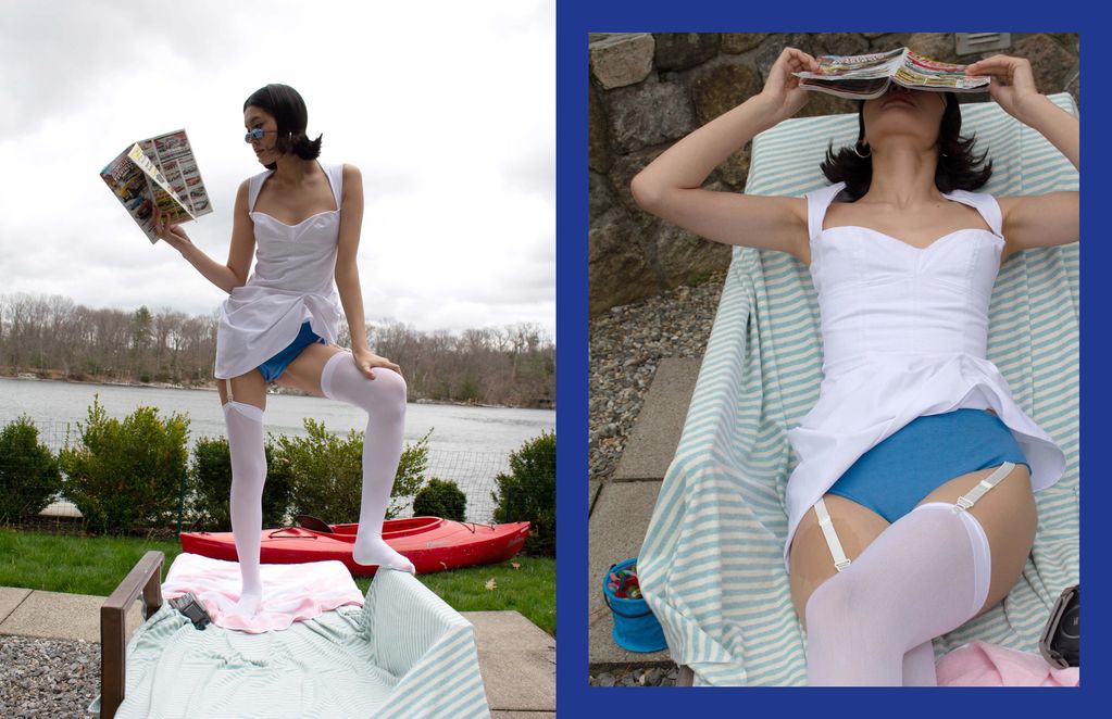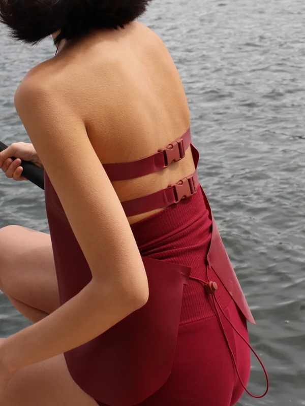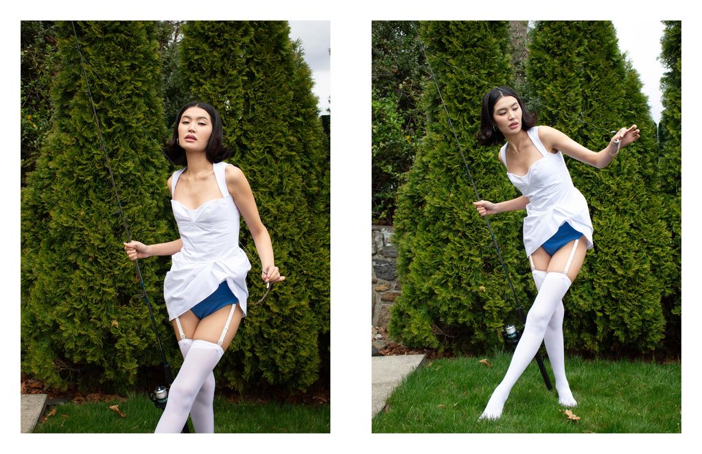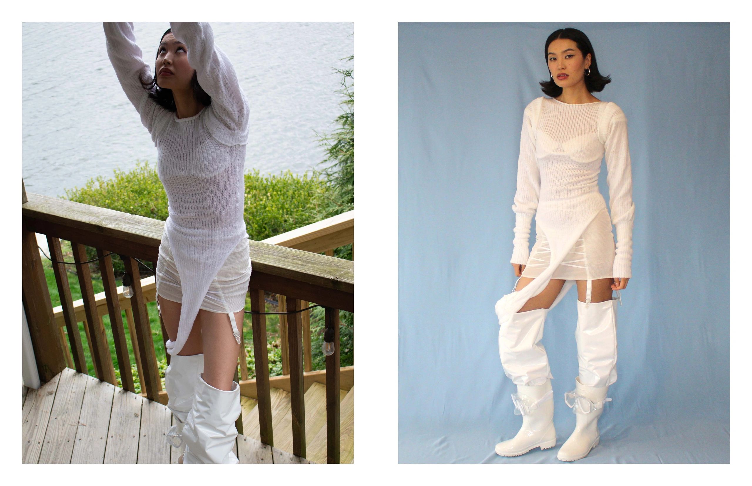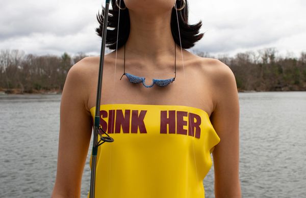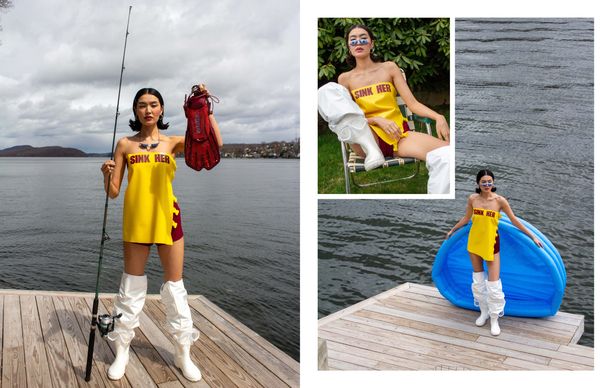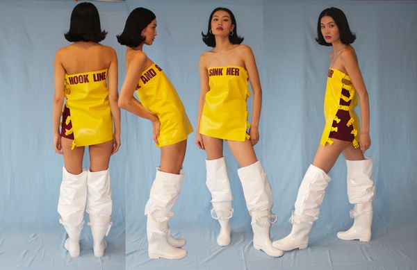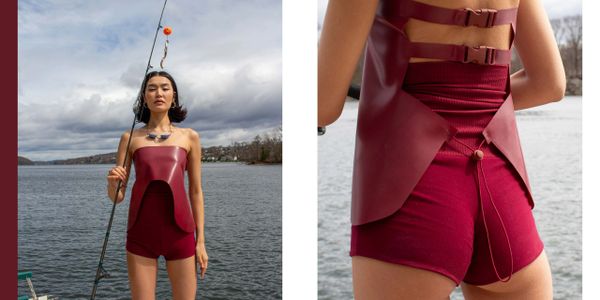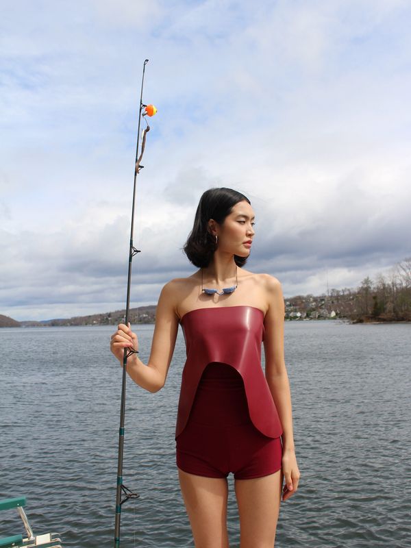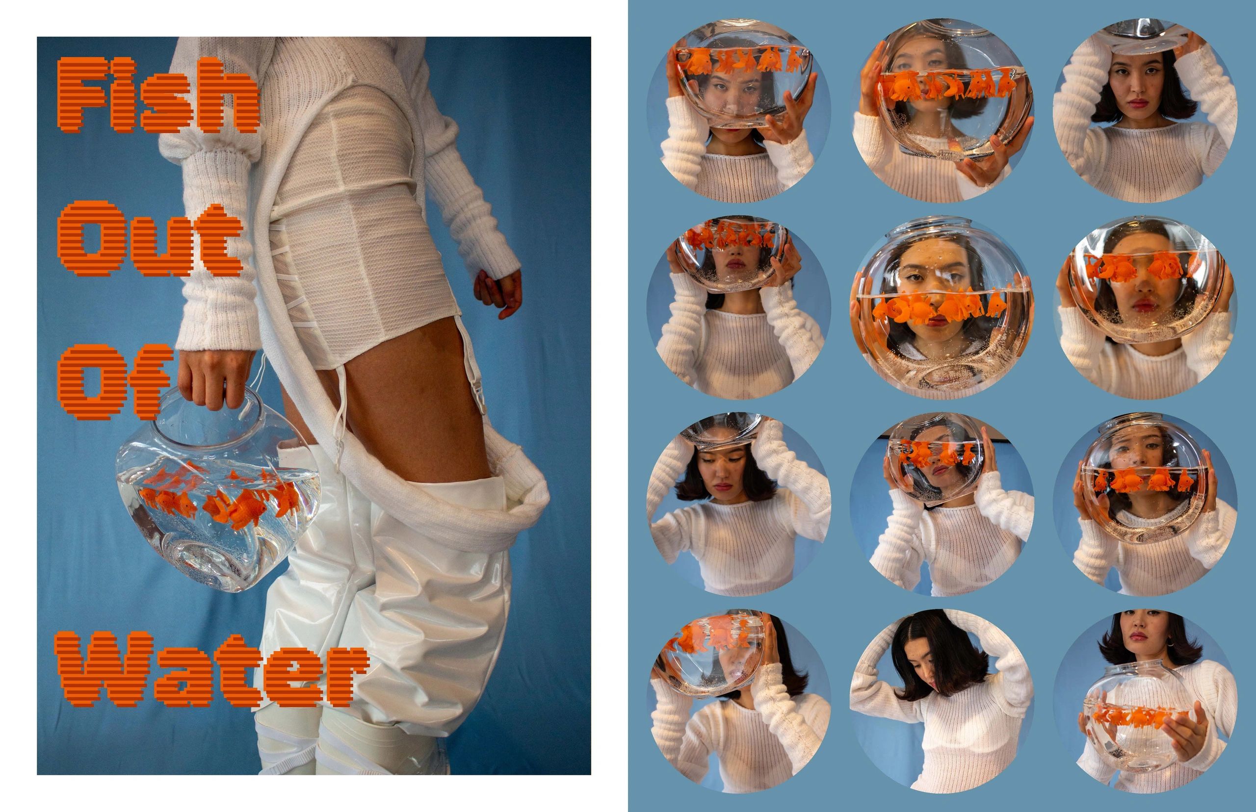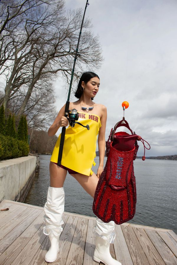 In Isabella Anand’s thesis collection: Fish Out of Water she combines popular phrases used in dating such as, “Plenty of Fish in the Sea” and “Catfish” as a way of making fun of what dating is like today. This collection was inspired by Anand’s experiences coming from a small community in Nassau, Bahamas to one of the biggest cities in the world, New York City. Essentially leaving her small pond to the great blue sea. This idea of hookup culture and modern day dating apps inspired this idea of having too many fish in the sea. She believes it is too easy to match with someone and get connected but it's never been harder to connect. This collection is essentially making fun of today's dating culture by using phrases like “Hook Line and Sink Her” to express how silly it all has become.